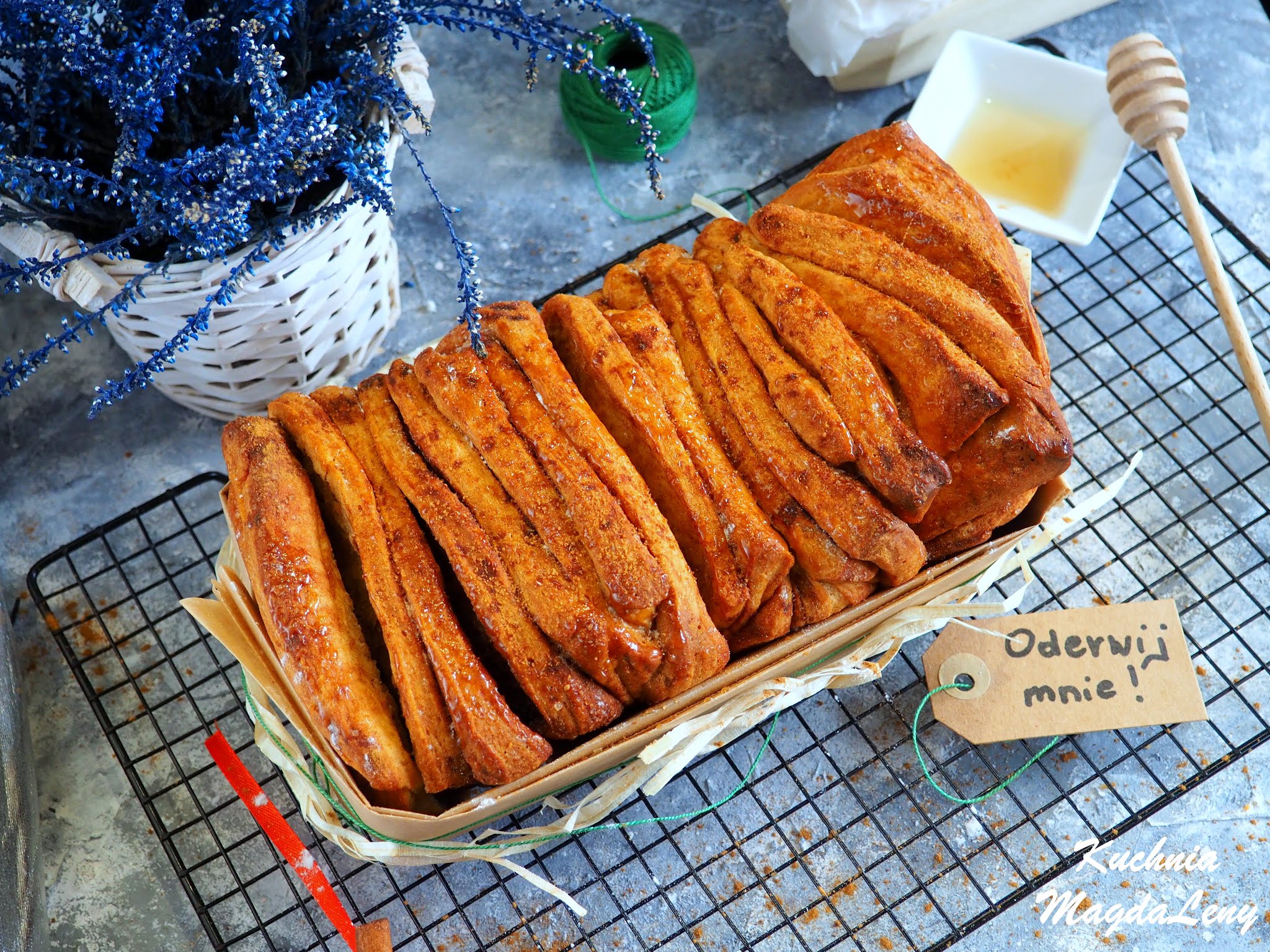 Ciasto drożdżowe w formie odrywanego chlebka w słodkiej wersji. Nie jest to zwykłe ciasto drożdżowe, lecz z dodatkiem mielonej marchewki, która wzbogaca chlebek w wartości odżywcze, gdyż jest źródłem wielu witamin i składników mineralnych. Taka mielona marchewka zachowuje wszystkie walory świeżego warzywa. Dodatkowo każda warstwa ciasta posmarowana jest masełkiem z cynamonem, dzięki temu zyskuje cudowny aromat i smak.